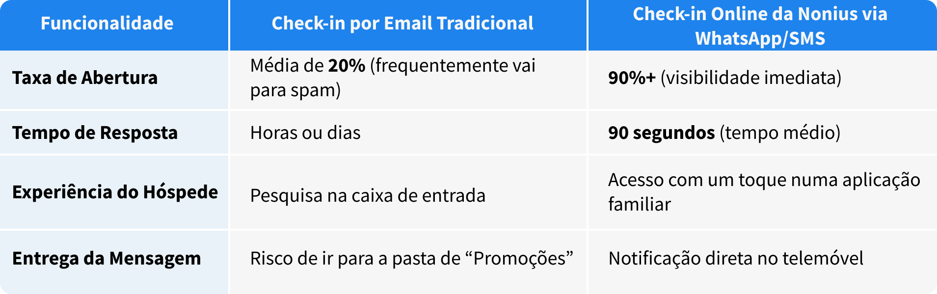 Ao contactar os hóspedes nos canais que utilizam diariamente, aumenta as taxas de conclusão do check-in online, reduz a sobrecarga na recepção e garante uma experiência de chegada mais fluida e eficiente.